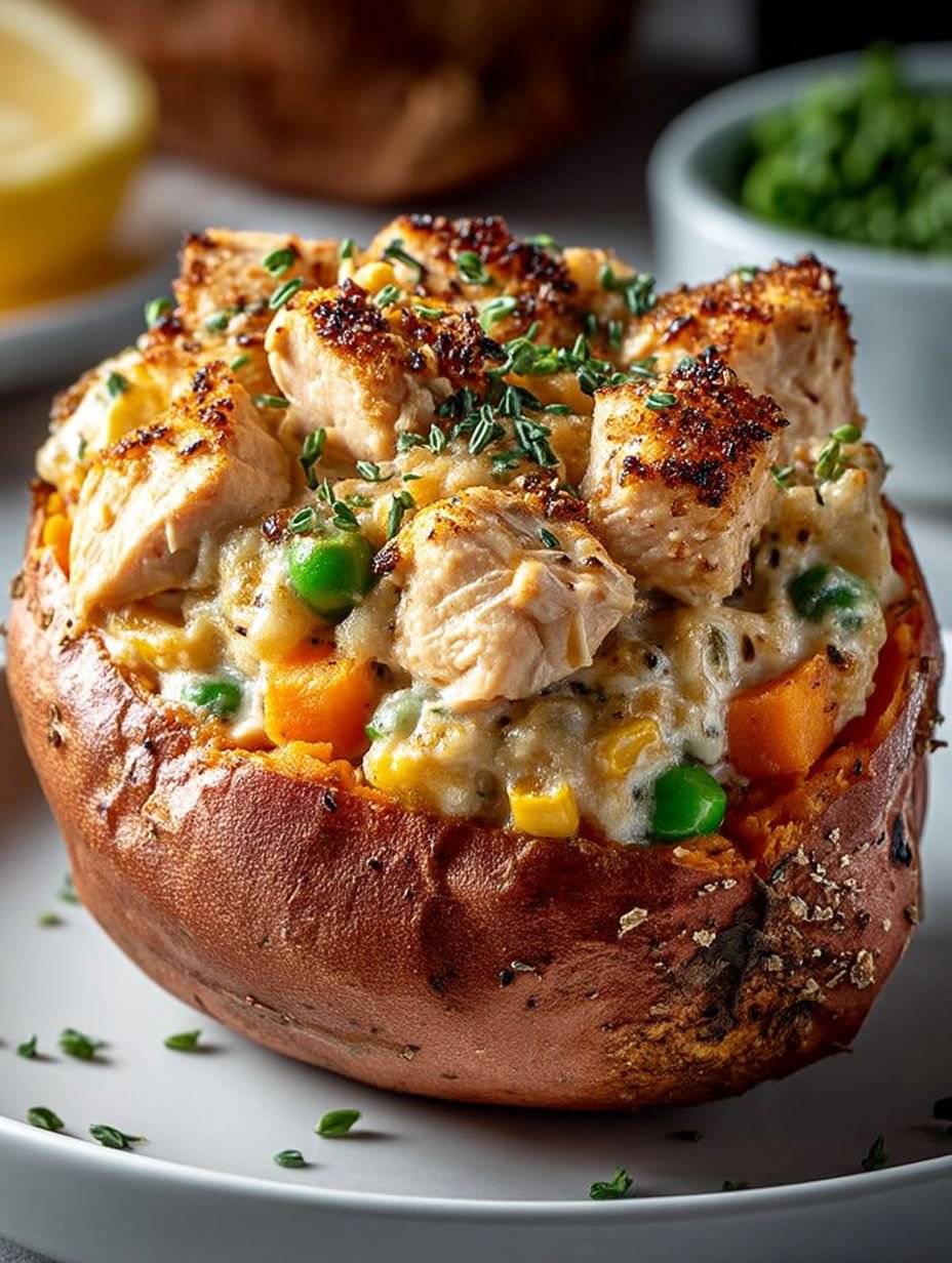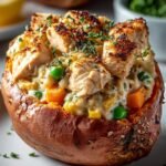 Chicken Pot Pie Stuffed Sweet Potatoes bring together the comforting flavors of a classic pot pie and the natural sweetness of sweet potatoes. This recipe is not only delicious but also nutritious, making it a perfect meal for any occasion. The creamy filling combined with the soft, baked sweet potato creates an irresistible dish that everyone will love. Don’t miss out on this delightful twist on a favorite comfort food! Try making Chicken Pot Pie Stuffed Sweet Potatoes tonight and savor every bite of this hearty, wholesome meal.