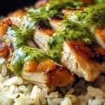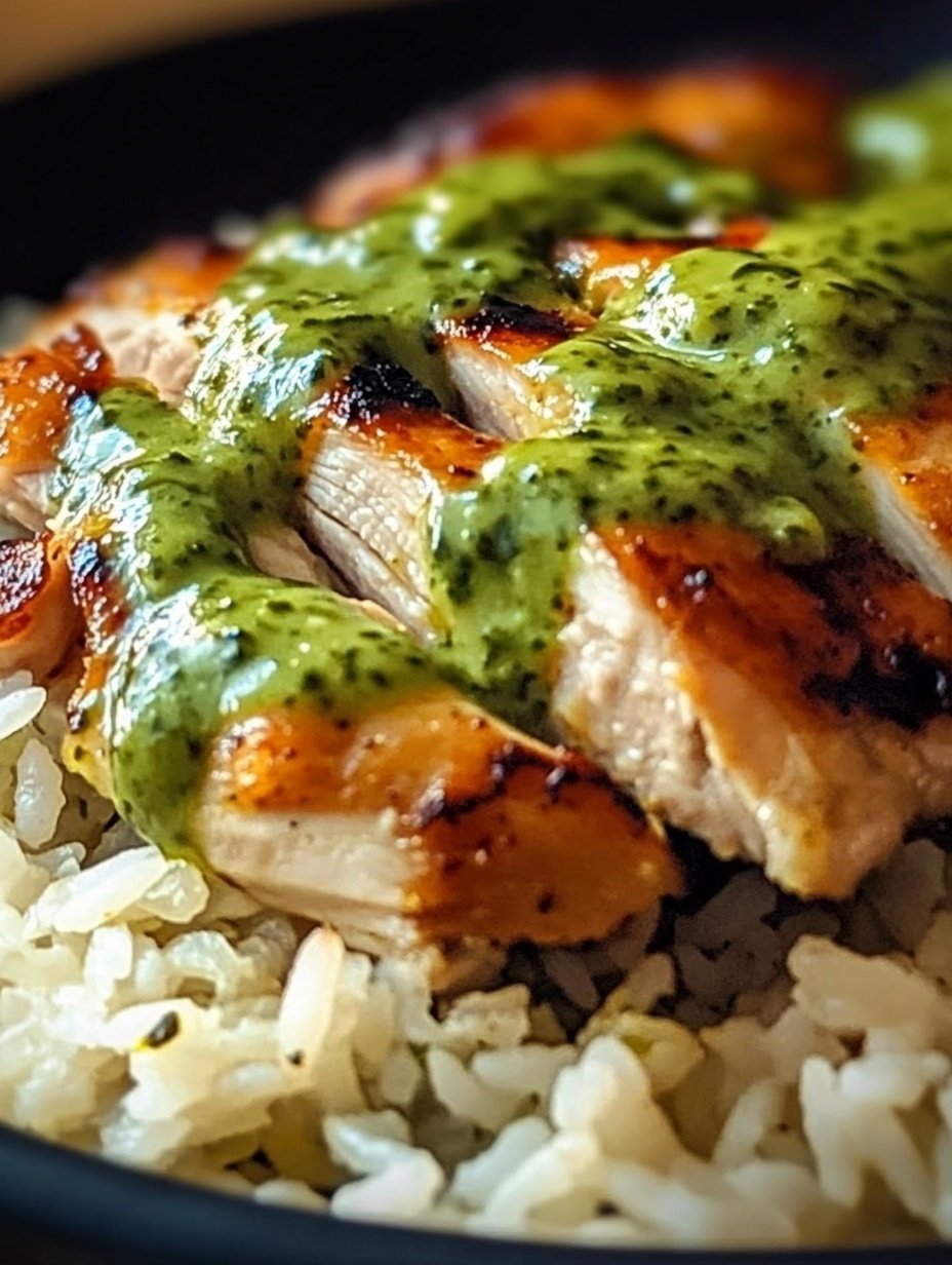 Fluff the rice with a fork, then arrange the chicken pieces on top. Drizzle generously with the chilled green sauce or serve the sauce on the side so everyone can add as much as they like. Garnish with a few extra cilantro leaves and a squeeze of lime juice for brightness.