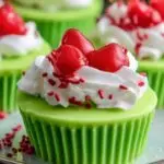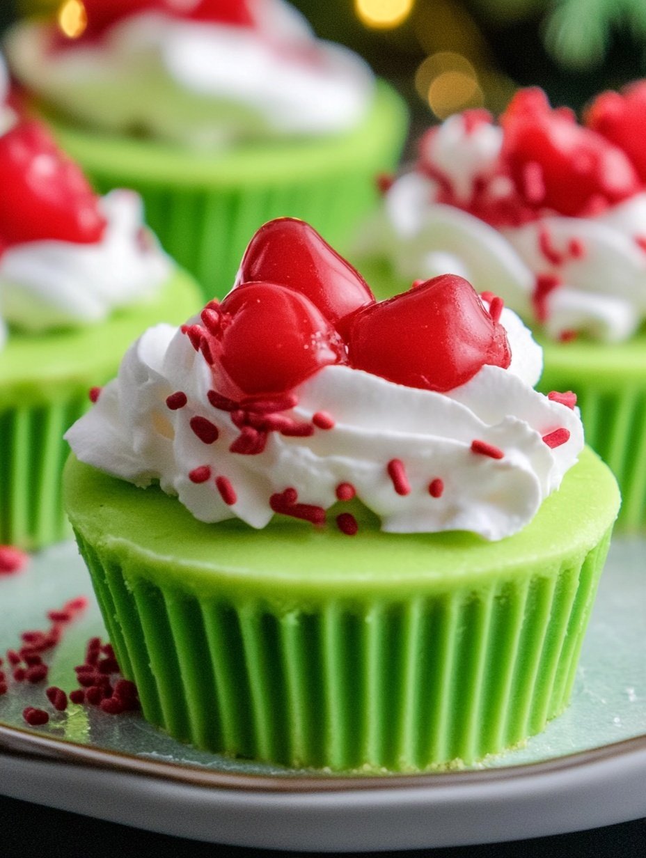Decorate: Once chilled, top the cheesecakes with whipped cream or frosting if desired. You can create a small swirl or add festive decorations such as edible glitter, red sprinkles, or mini candy pieces to enhance the Grinch theme.