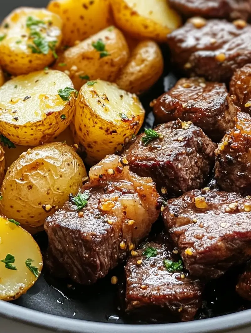 Finish with herbs: Sprinkle freshly chopped parsley over the dish for a fresh, vibrant touch. Adjust seasoning if necessary. The combination of golden potatoes, tender beef, and rich garlic butter will create an irresistible aroma and taste.