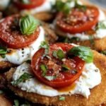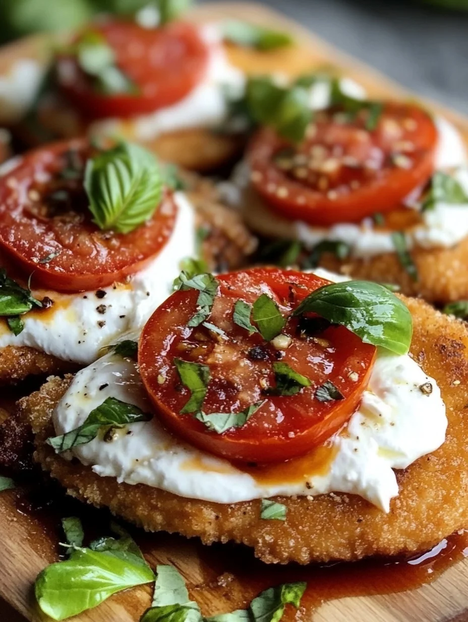 To assemble, place the crispy chicken cutlets on a serving platter. Spoon the tomato mixture over the top, making sure each cutlet gets a generous amount. Tear fresh basil leaves and scatter them over the dish. Finally, place pieces of burrata on top of the tomatoes. For extra flavor, drizzle with balsamic glaze if you like.