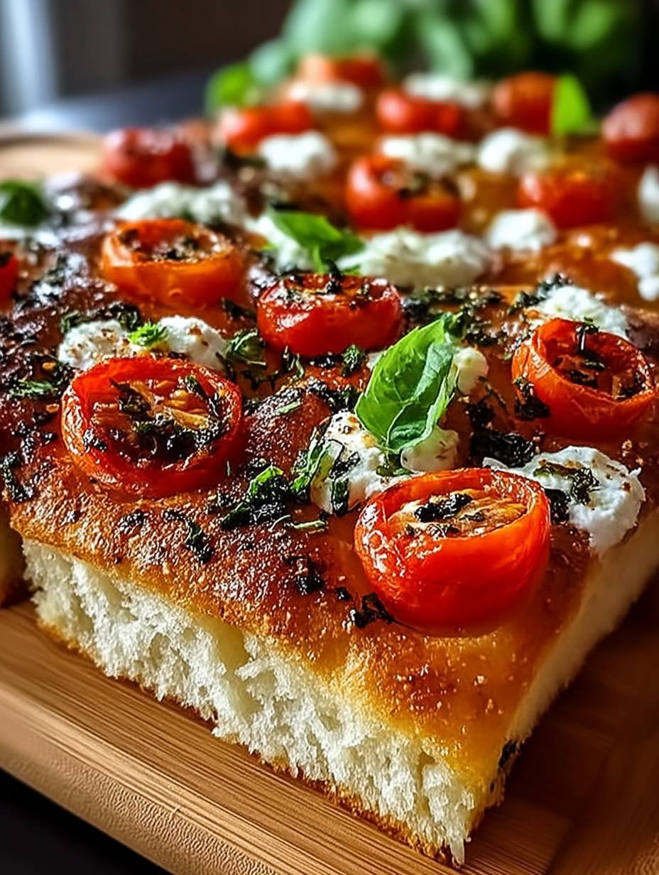 The aroma of freshly baked Margherita Focaccia Bread wafts through the air, combining the rich scent of olive oil with the sweet notes of ripe tomatoes and fragrant basil. With its golden-brown crust and soft, pillowy interior, this bread is a feast for both the eyes and the palate.