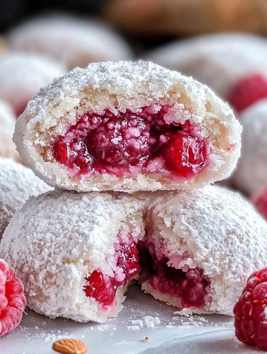These Melt-In-Your-Mouth Raspberry-Filled Almond Snowball Cookies are a delicate fusion of buttery almond flavor and fruity raspberry sweetness. Their soft, crumbly texture contrasts beautifully with the jam-filled center, making them a festive favorite or a year-round indulgence. Perfect for gifting, tea parties, or cozy afternoons, these cookies are as elegant as they are delicious.
