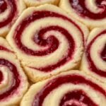 Form the Cookies: Take a portion of dough and roll it into a log about 1 inch in diameter. Flatten slightly with your hands or a rolling pin. Spoon small amounts of the warmed raspberry puree onto the dough and use a skewer or knife to gently swirl the puree, creating a marbled effect.